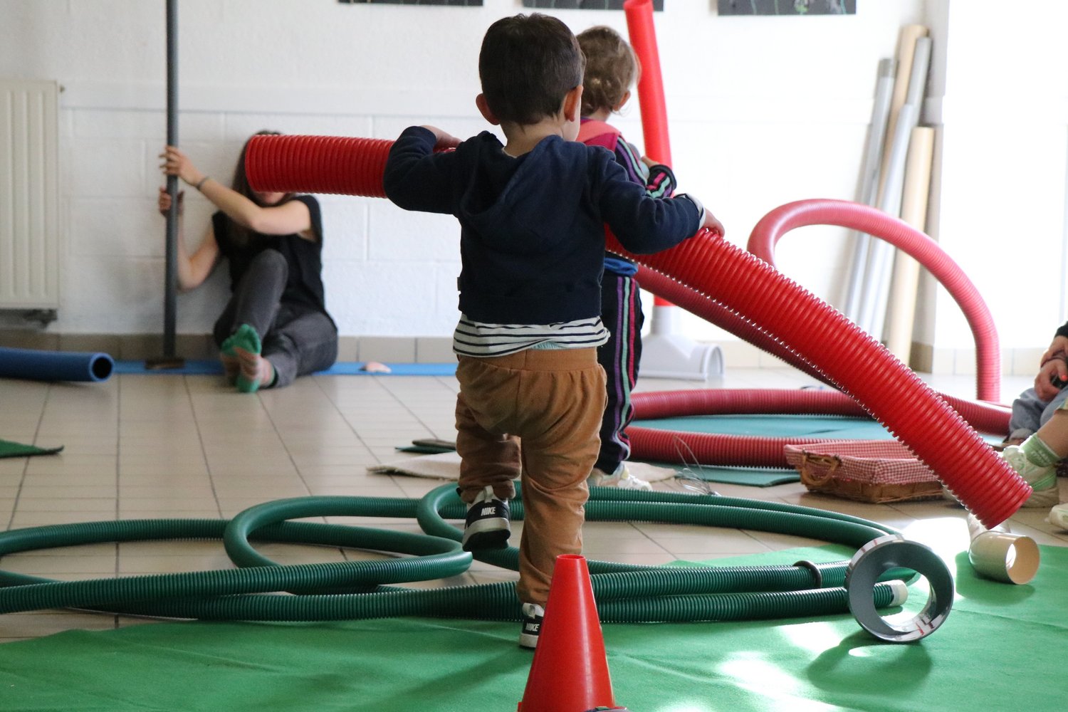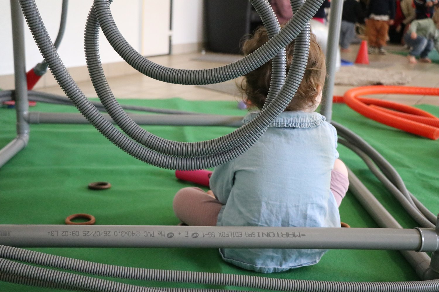 Le but ici pour les enfants de la crèche : explorer un maximum de sons. Les tuyaux de récupération se transforment tantôt en carillon, en flûte, en claves, ou encore en petit grattoir.