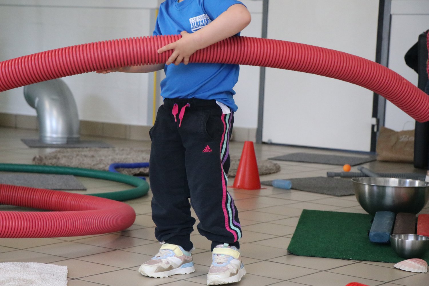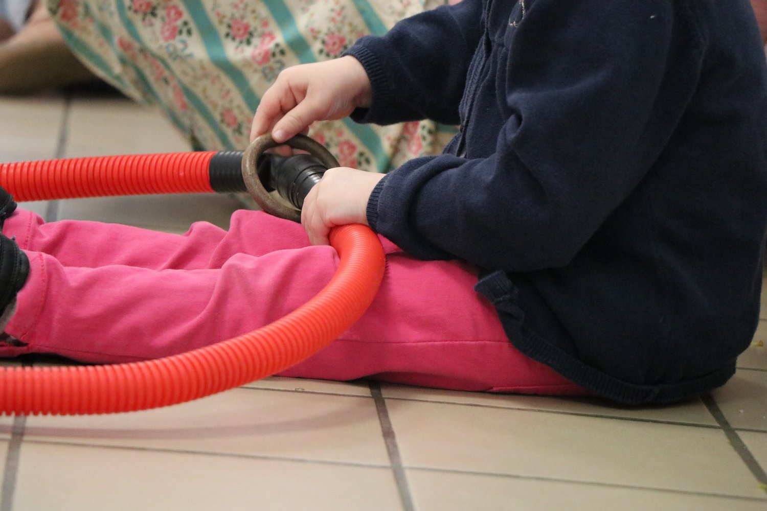 L'atelier proposé par l'équipe Petite Enfance de la Ville de Morlaix et les artistes du spectacle sonore et musicale "Maxi Tuyaux", permet aux tout-petits d'explorer chacun à son rythme. Les tuyaux en plastiques disséminés dans la pièce de vie de la crèche constituent autant de curiosités les uns que les autres. Les enfants de la crèche divisés en petits groupes sont accompagnés par les auxiliaires de puériculture, les assistantes maternelles et les assistantes d'accueil de la Ville. Ensembles ils manipulent, jouent, soufflent ou chantent dans ces ustensiles du quotidien transformés en objets d'exploration. À l'instar de la "machine à tickets", plusieurs attractions sont disposées dans la pièce. Cette machine, assemblée avec à une gaine flexible dont une extrémité repose en hauteur, laisse dévaler les balles de ping-pong, les fameux "tickets" créant une petite mélodie, avant de finir leurs courses sur un xylophone au sortir du tuyau.